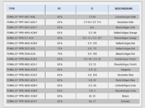 Bei den ROWALID® ACN-F Typen handelt es sich um hochkonzentrierte Einzelfarbstoffpräparationen, die in einem PMMA-Trägersystem eingebunden werden. Zur Herstellung von ROWALID® Präparationen kommt ein spezieller Produktionsprozess zum Einsatz, durch den ein maximaler Verteilungsgrad der Farbstoffe angestrebt wird, wie er mit konventionellen Dispergiermethoden nicht erreichbar ist. Die Lieferform „Mikropulver“ in einer definierten Korngrößenbandbreite ermöglicht nicht nur ein großes Verträglichkeitsspektrum, die Additiv freien Farbstoffdispergierungen garantieren ebenfalls eine hohe Farbstärke und Transparenz.